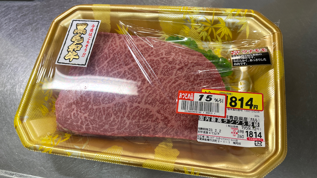 昨夜の肉が凄えうまかったので 帰り23時頃に昨日と同じスー パーに寄った。塊肉がなかった のでカット肉を。かいのみとせ んぼんを購入。つかせんぼんっ て初めて。筋肉質でうまい。 せんぼん説明 |