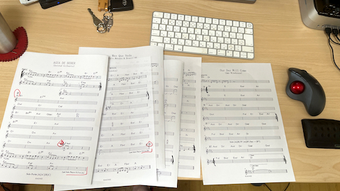 明日からレッスンが再開して新 しい生徒さんが2人増えるので まずはウクレレのレッスンのた めの楽譜書き。モニタースタン ド買い替えて机が広くなったの で楽譜書きが楽になった。 | ![]() |