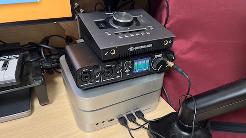 18i20とOctoPreを ラックに入れてADATケーブ ルで結線してクロックシンクさ せた。MacとはUSBーCケ ブル1本で繋がるのがとても便 利。これをモバイル用の↓ |