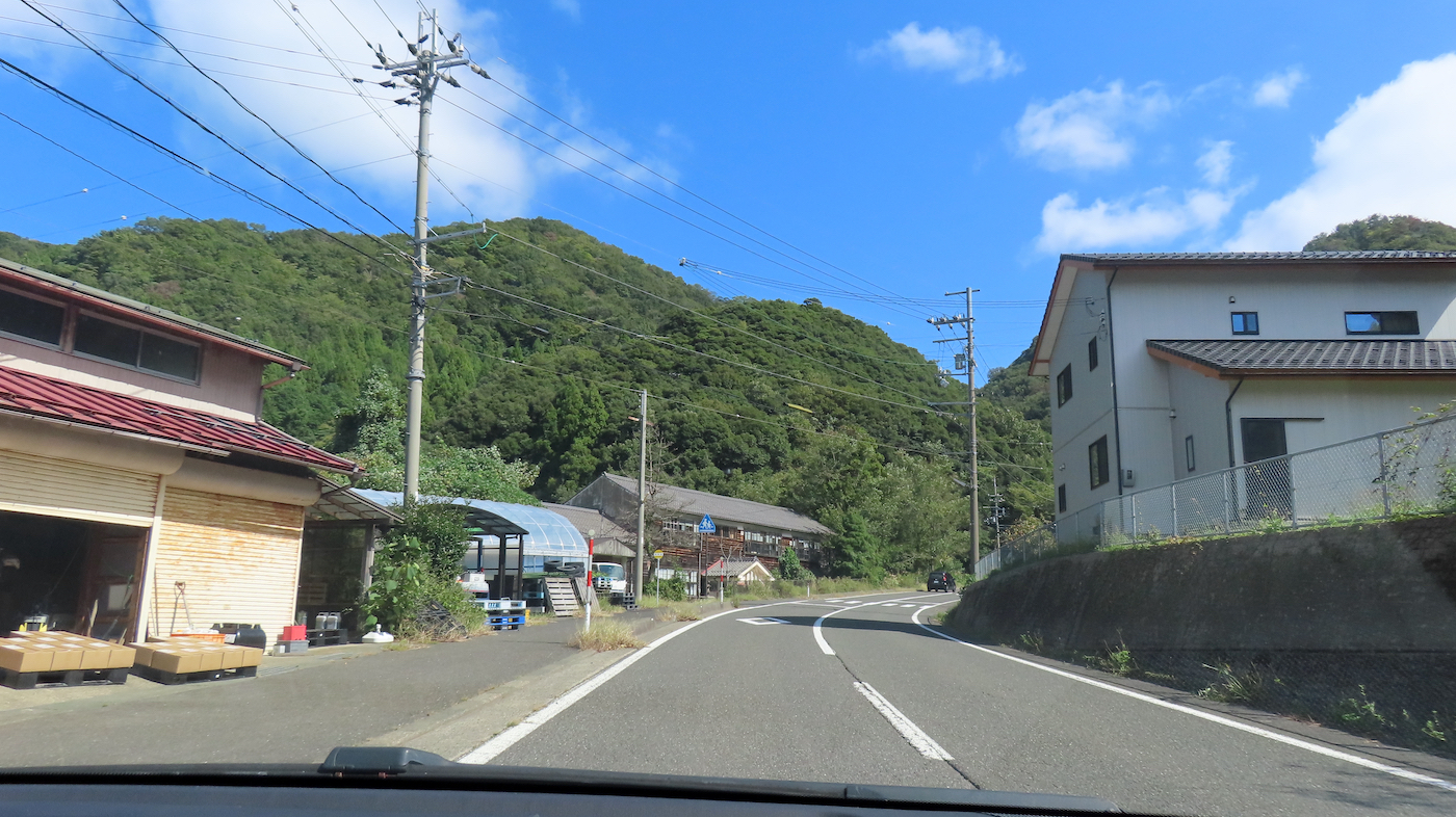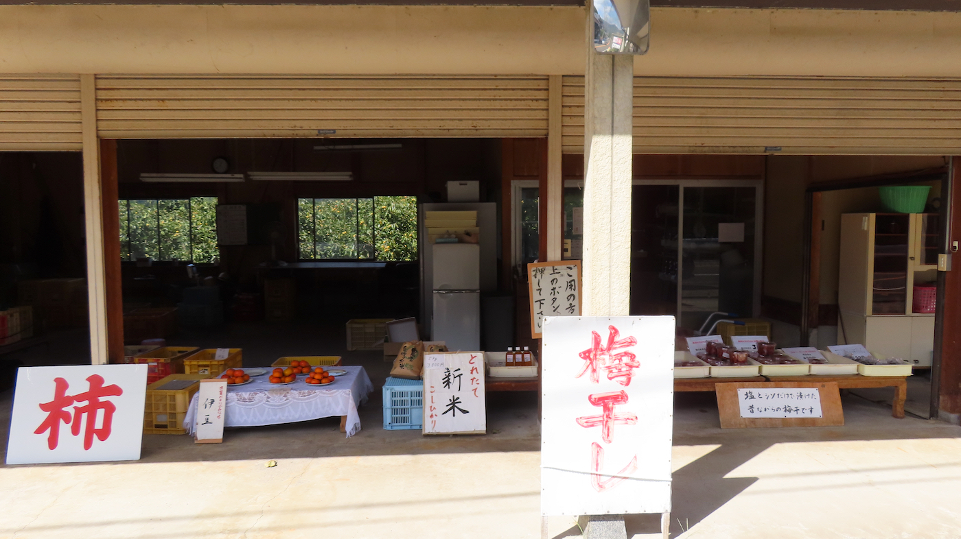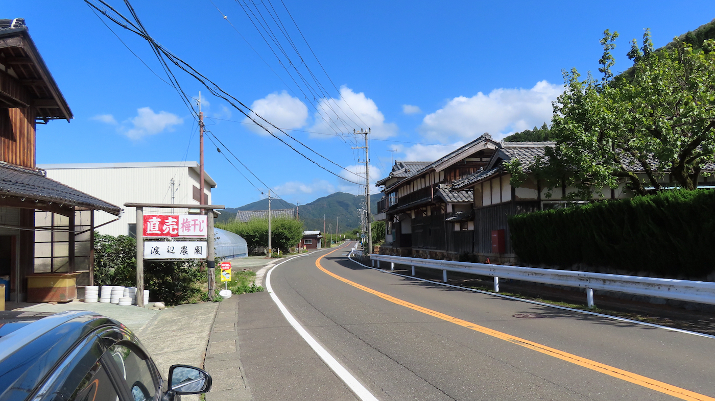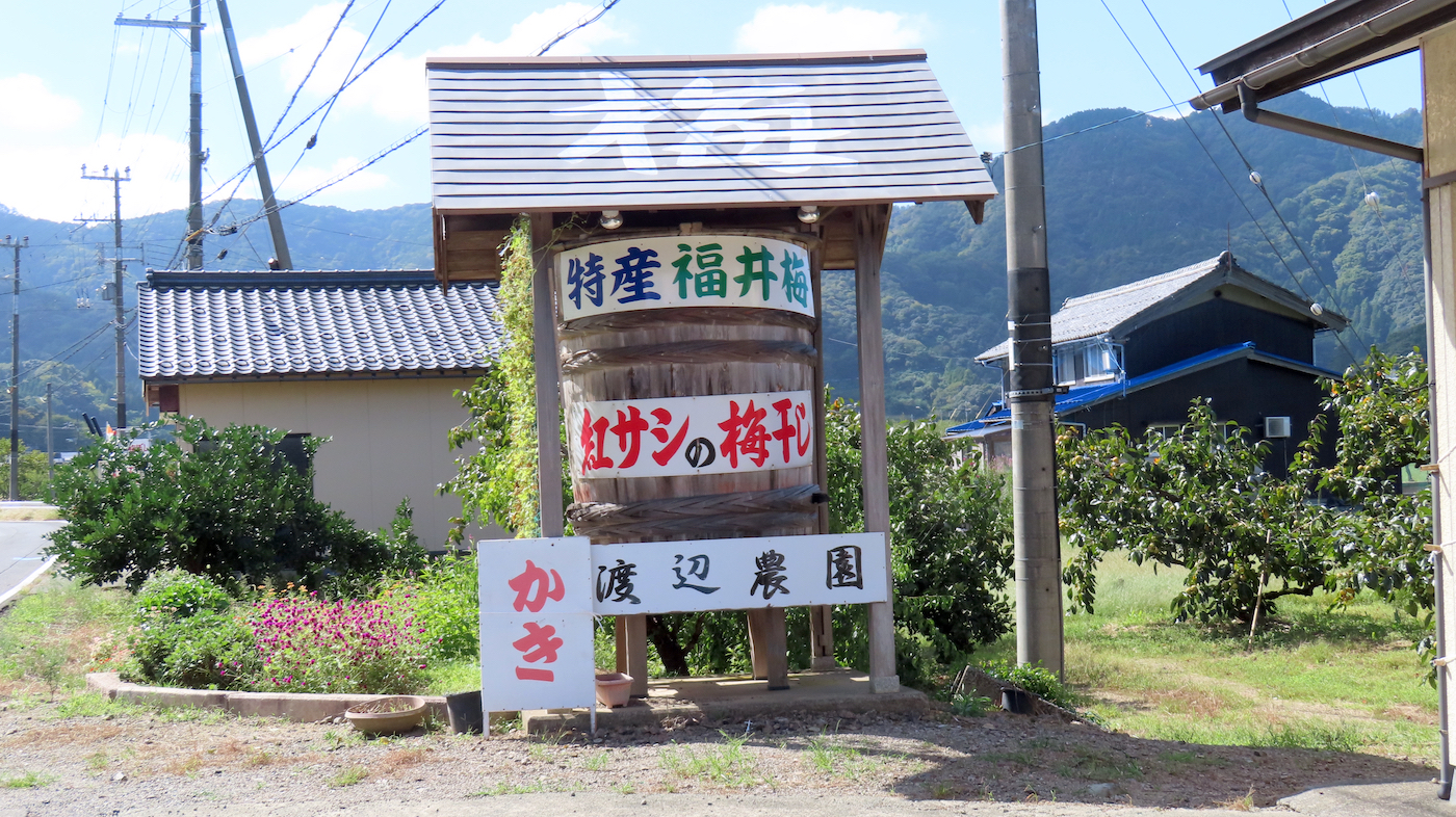 1年前にも寄った渡辺農園に立 ち寄った。呼び鈴を押すと向か いの家から去年はお爺ちゃんが 出てきたけど、今回はお母さん が出てきて対応してくれた。今 回も大量の梅干しを購入。 大きな写真 渡辺農園看板 渡辺農園横の道 | ![]() |
