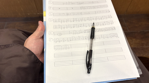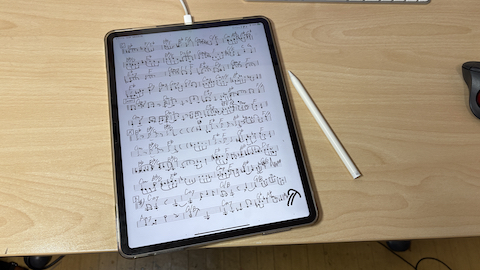 休日。今日も発表会の仕込み。 全ての曲のベースラインをコピ ーしてiPadに書き込みして 全部で12時間以上かかった。 もし紙でプリントアウトしたら A4でたぶん80枚くらい。 |