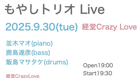 来週の金曜日の30日、目白M ARK VIにて19時半&21時 頃からBeanSprouts Trioのライブがあります。 ドラム真船駿の勢いのあるプレ イをぜひ観てください。 大きな写真 | ![]() |