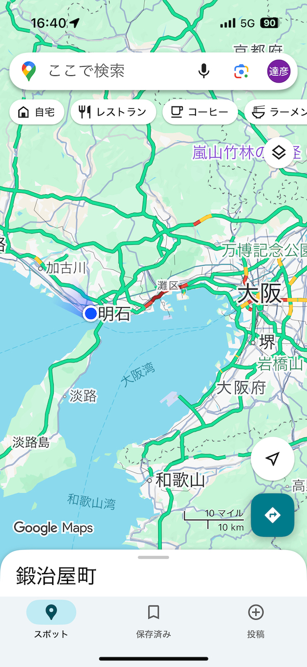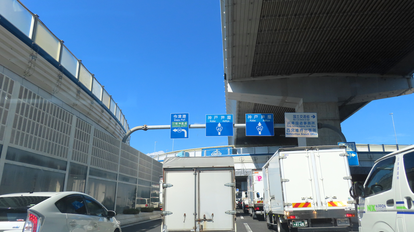 土山SA、10時過ぎに吹田S Aで休憩して10時半過ぎに西 宮出口で高速を降りて12時半 に明石駅前に到着。ホテル近く のコイン駐車場に車を停めて、 電車に乗り換えて神戸↓ 高槻JCT 土山SA 吹田SA 国道43号 |