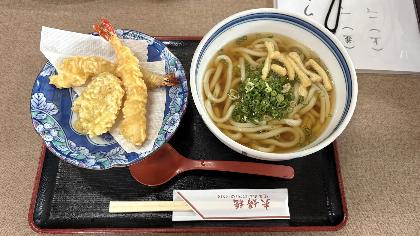 凄え快適ドライブ。13時前に 道路脇に見つけたお食事処夫婦 橋で昼飯。めちゃいい感じの食 堂で、頼んだ天ぷらうどんもう まい。うどんがメイン&白出汁 が関西にいるなって感じ。 大きな写真 店の外観 |