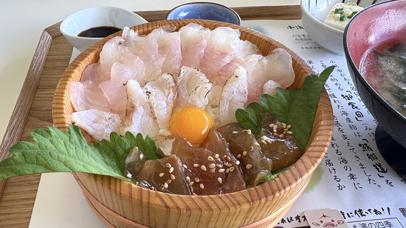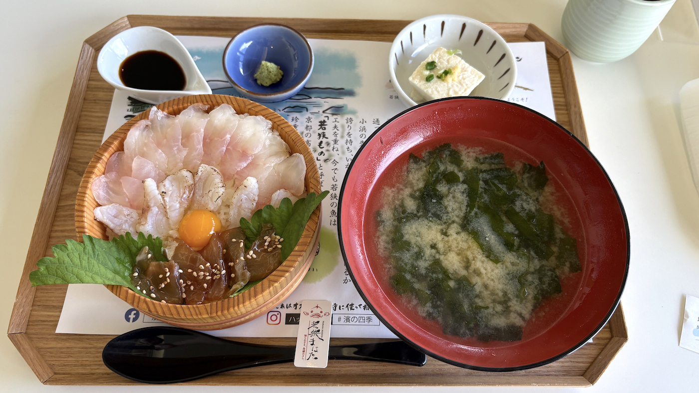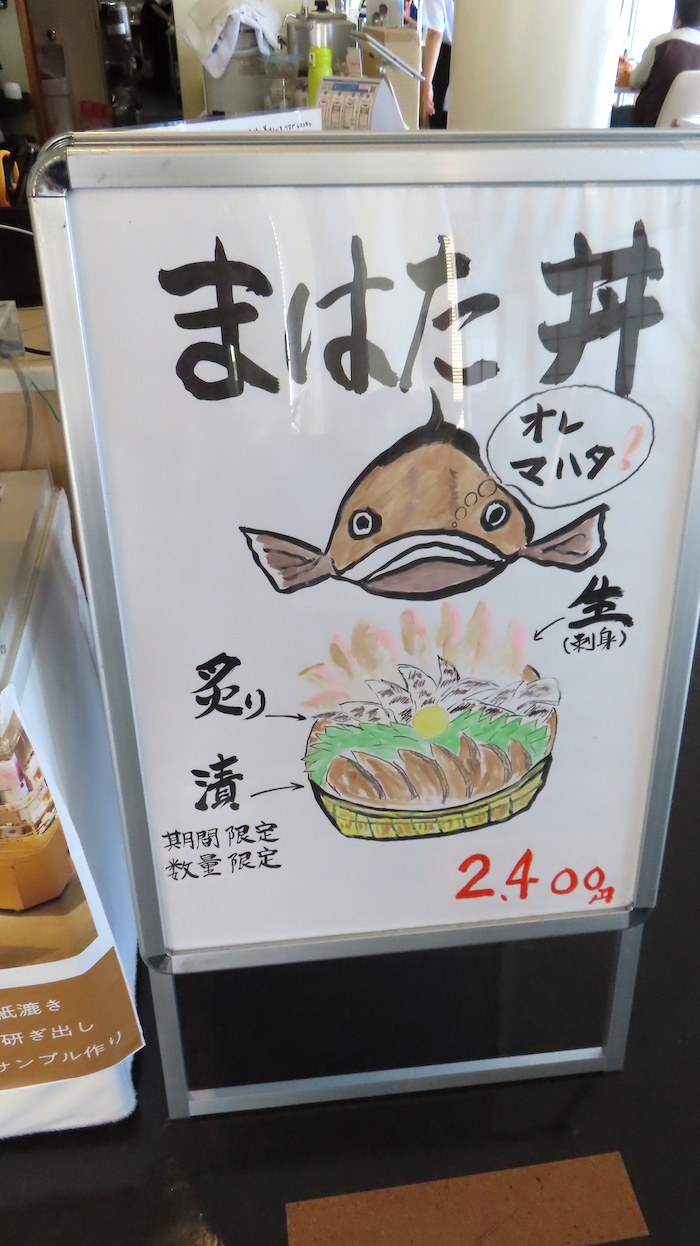10時半にホテルをチェックア ウトして出発、11時過ぎに若 狭湾の横にあるお食事処、濱の 四季に到着。魅惑的なメニュー の中からまはた丼を選択。これ が大当たりでめちゃうまい。 大きな写真 まはた丼アップ まはた丼看板 鯖の天ぷら 店の外観 | ![]() |