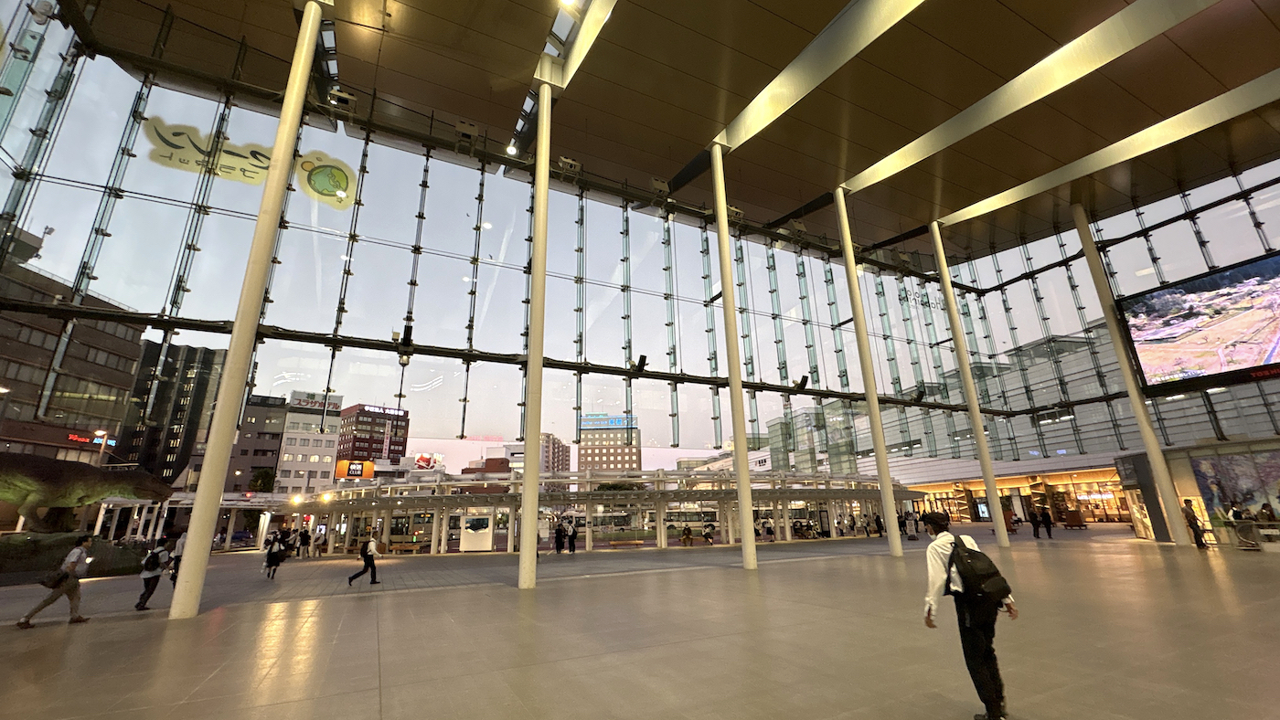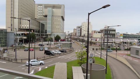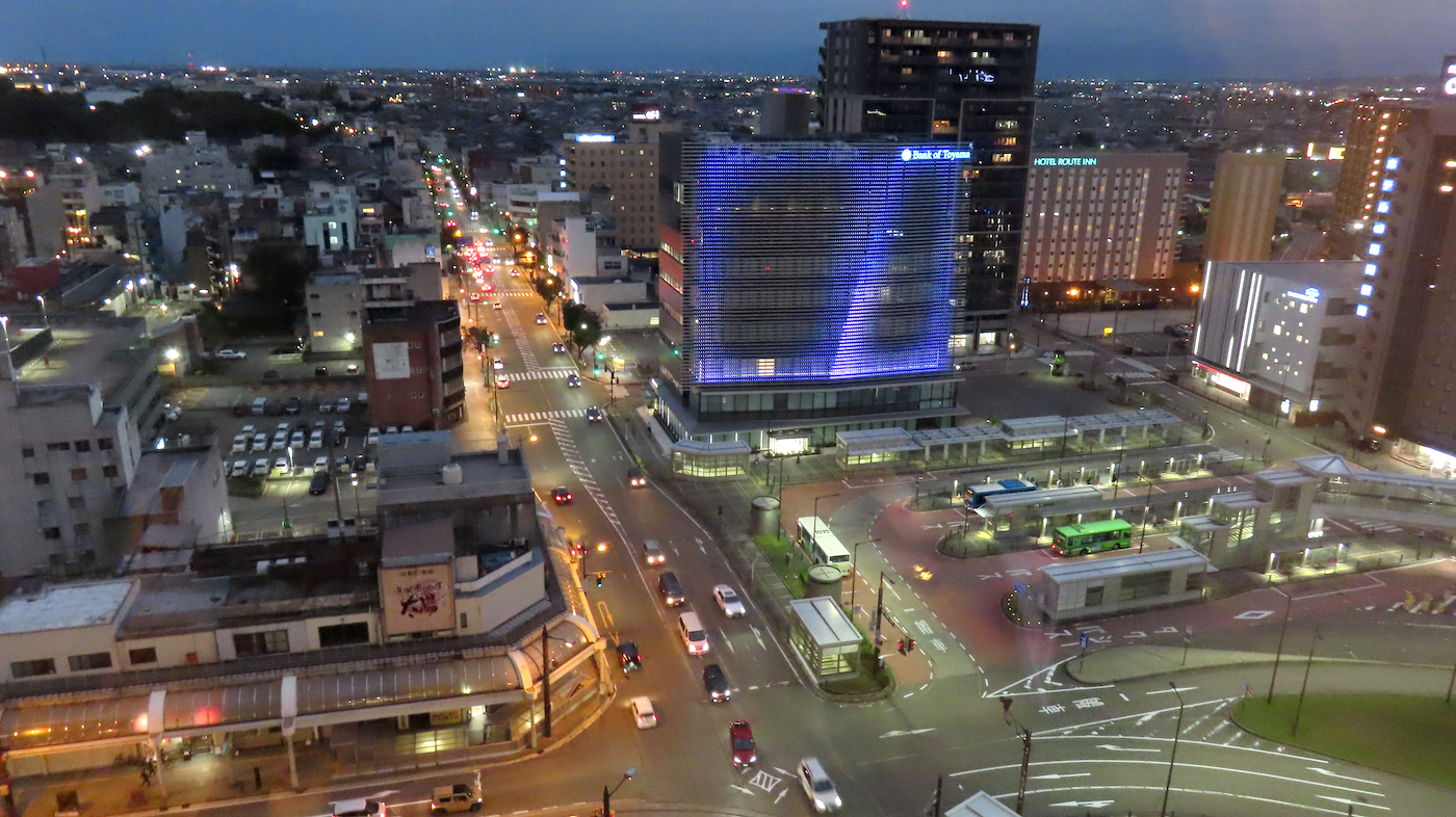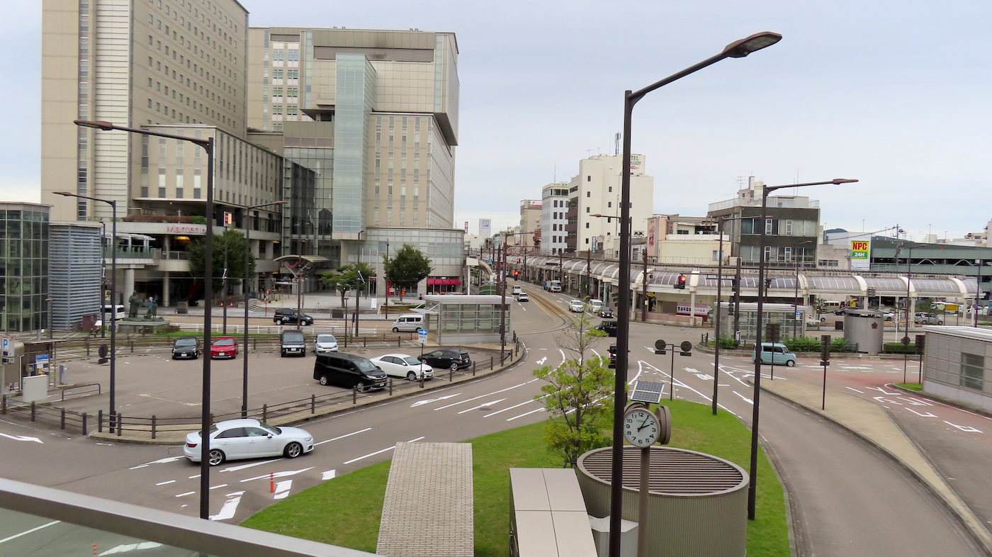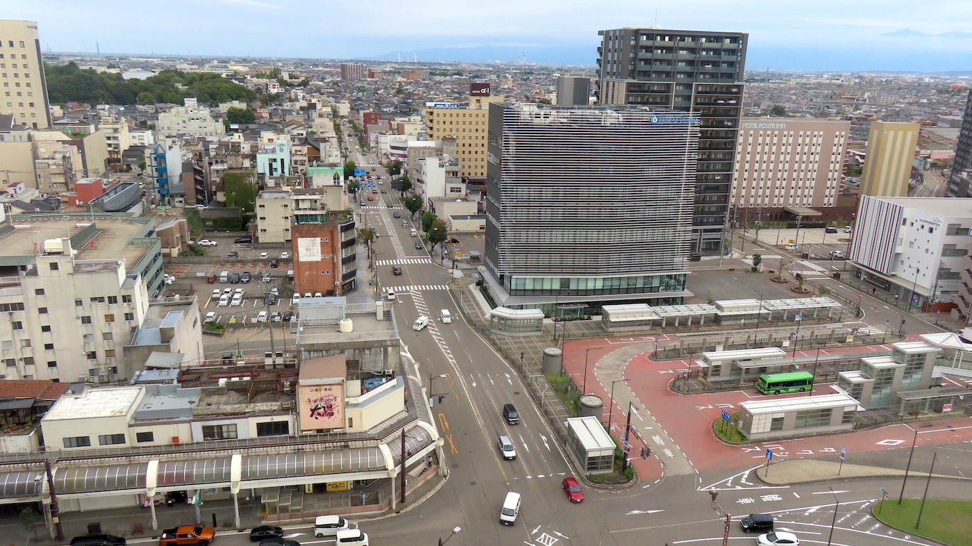 から一気に曇ってきた。14時 前に初めて訪れる高岡駅前に到 着してコンビニでビール買って チェックイン。静かで落ち着い た街の印象。高岡に来た理由は 行ってみたい居酒屋が↓ 大きな写真 14階からの駅前 路面電車 | ![]() |