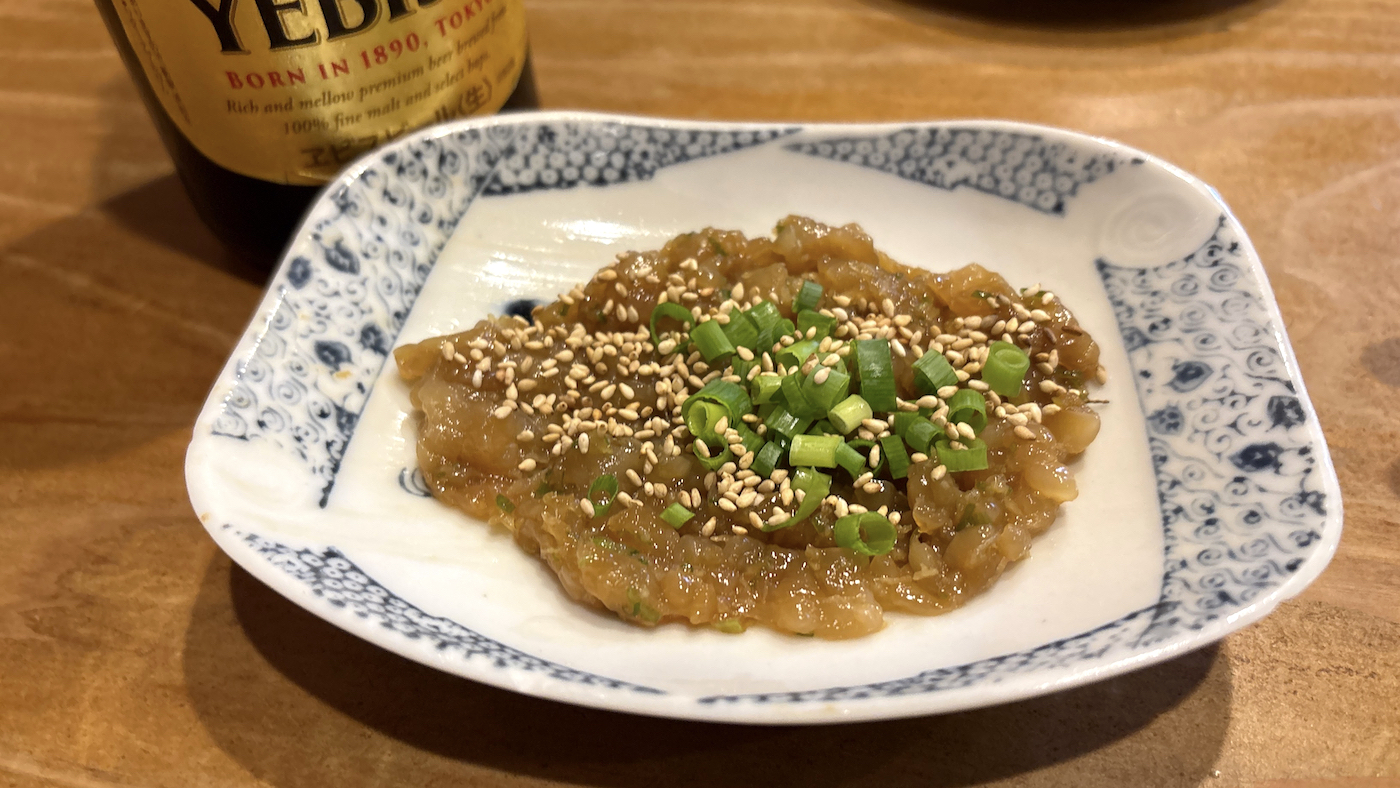 ある事。夢さきという小さな店 で、なんと15時オープン。と いう訳で15時過ぎに入店。お 通しの秋刀魚を炊いたのがうま くて、ここはうまいもん食える と確信。まず来たイカの↓ ザストロ お通し イカのなめろう 自家製豆腐 すりみ揚げ |