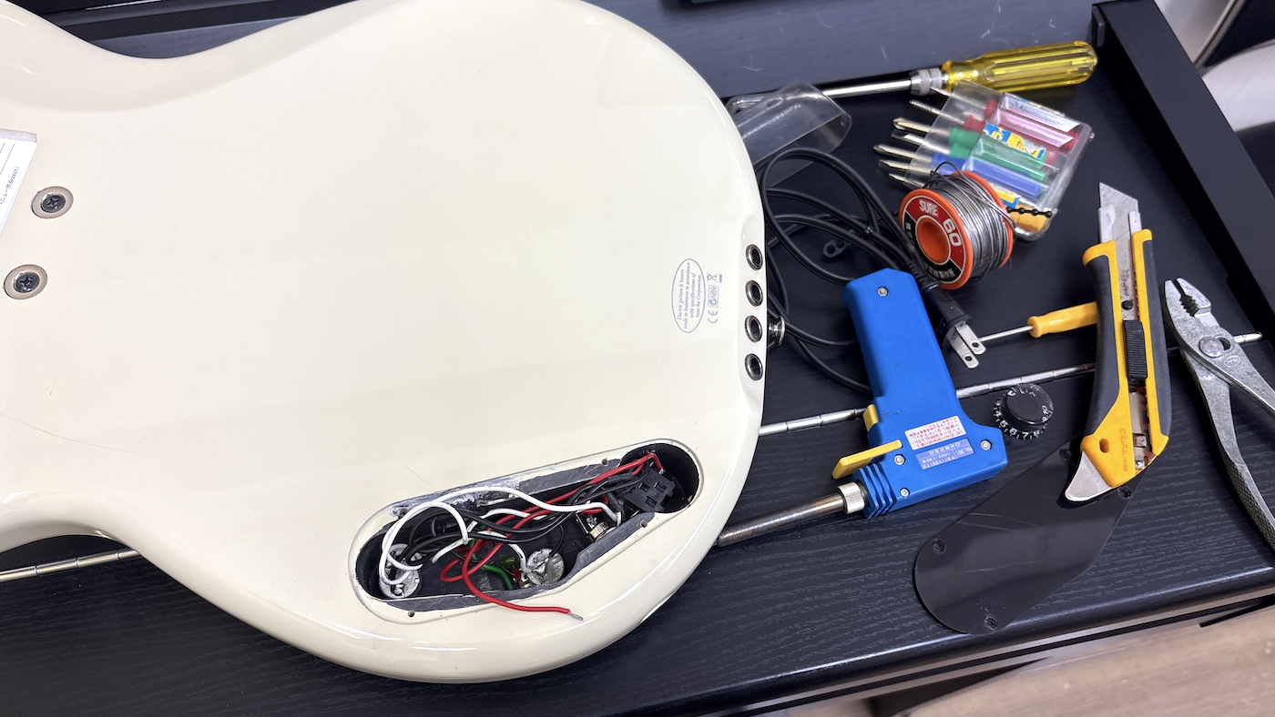 音が出なくなったヤマハ備品ベ ースの修理。休憩時間に裏パネ ル外して回路を確認して断線箇 所を特定して、レッスン後にハ ンダ付けして修理完了。つか俺 修理屋じゃねえんだけどw 断線箇所 |